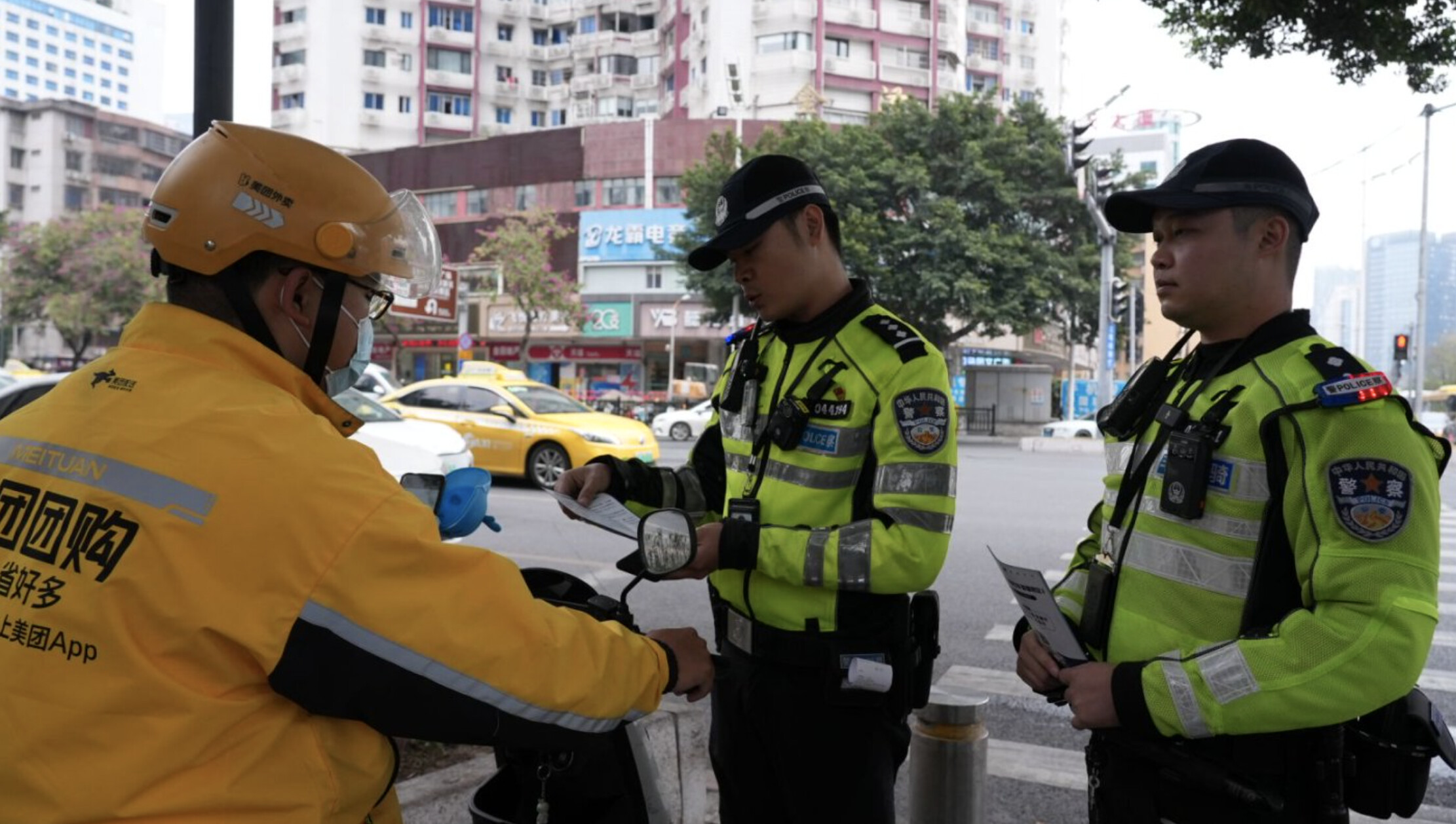 12月25日中午,广州市河汉区黄埔正途西与体育东路交叉口“电鸡”通行流量大,不乏外卖小哥、上班族骑“电鸡”出行的身影。多名执勤交警在路面派发宣传单,向车主宣传新规现实;同期,对违规的“电鸡”车主照章处罚。